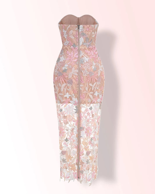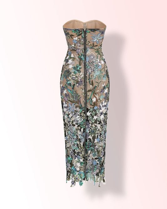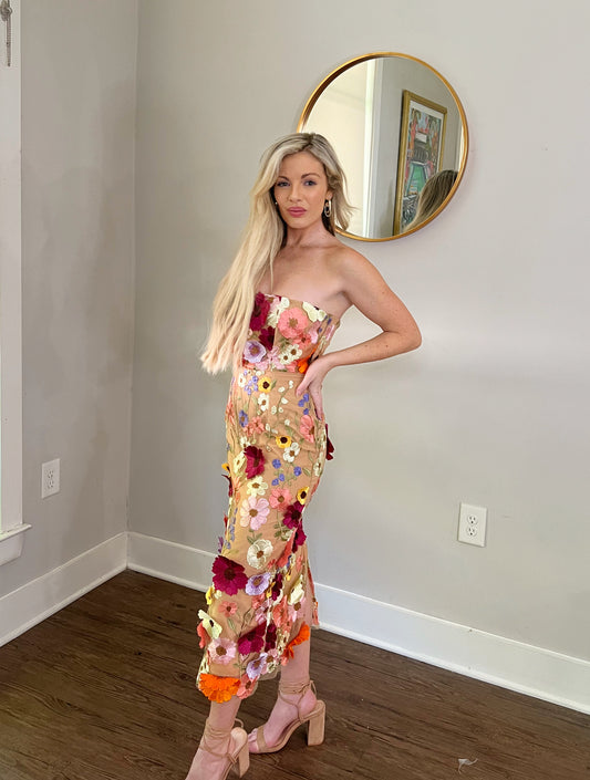 Strapless Wildflower Midi Dress - Chic 3D Floral Cocktail Attire or Wedding Guest Dress