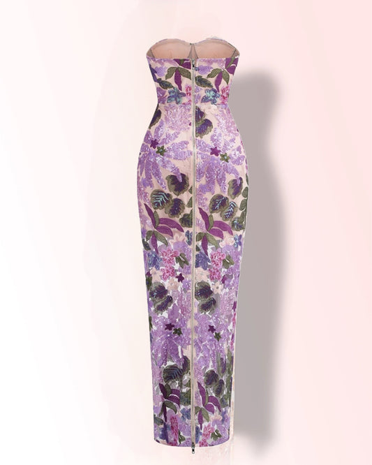 Lavender Sequin Floral Embellished Embroidery Midi Evening Gown