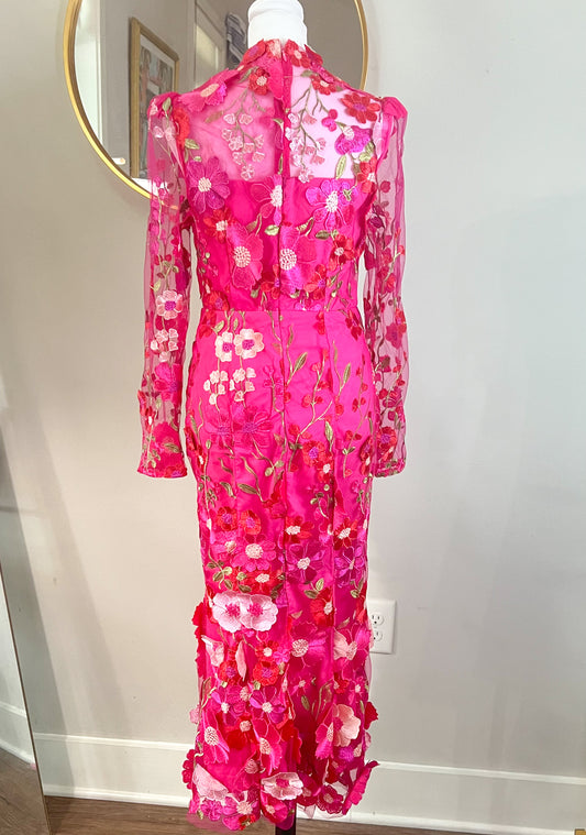 Long Sleeve Hot Pink Floral Midi Wedding Guest Dress
