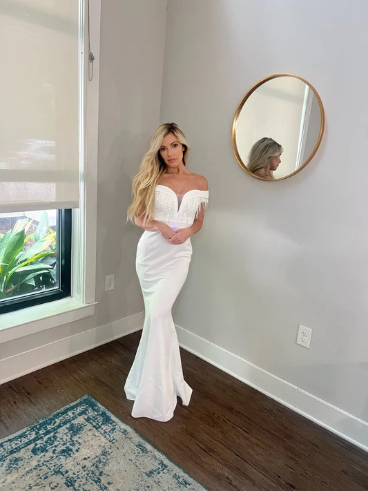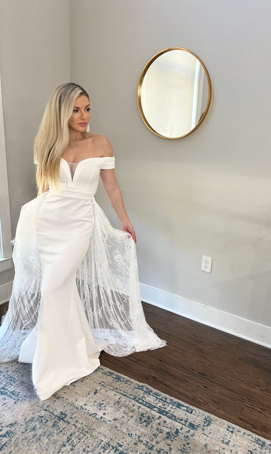 Appliques and Lace Deep V Wedding Dress with Off Shoulder Sleeves and Removable Satin Train Two Piece Set