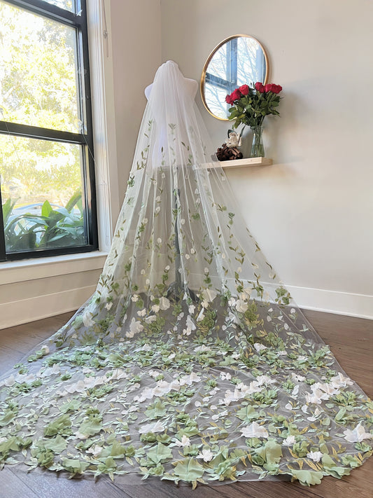 3D Green and White Floral Appliqués Garden Fairy Floor Length Wedding Veil