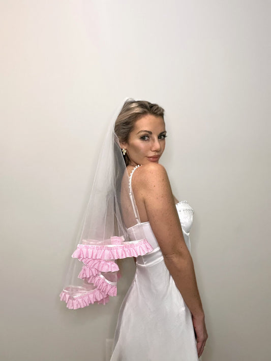 Pink Pretty Gingham Ruffle Trim Wedding Veil, Bachelorette Party Bridal Veil