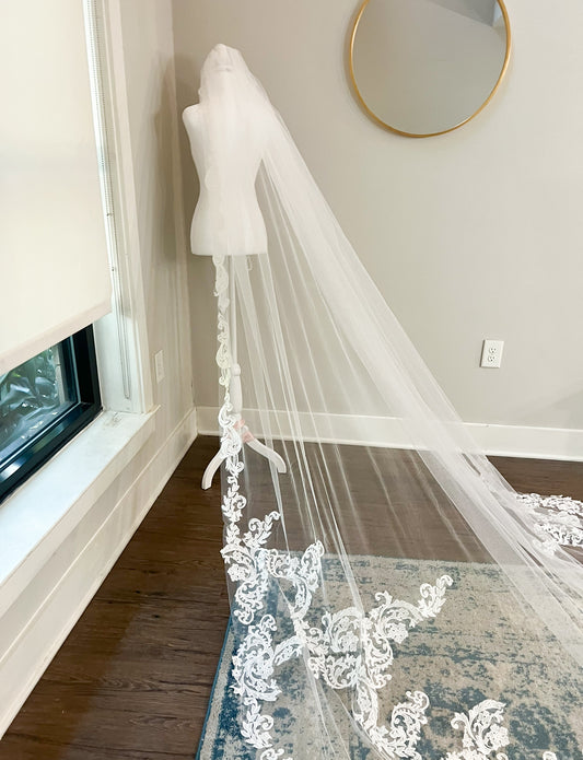 Cathedral Length Wedding Veil with Floral Embroidered Trim
