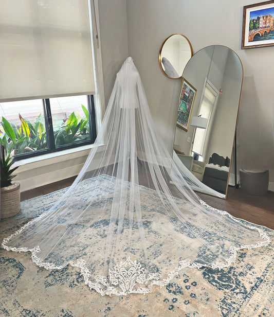 Elegant Cathedral Length Sheer Tulle Wedding Veil Scalloped Intricate Lace Trim with Comb