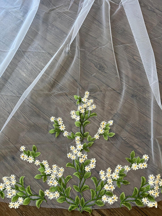 Green Leaves and Daisy Flowers Garden Party Embroidered Wedding Veil