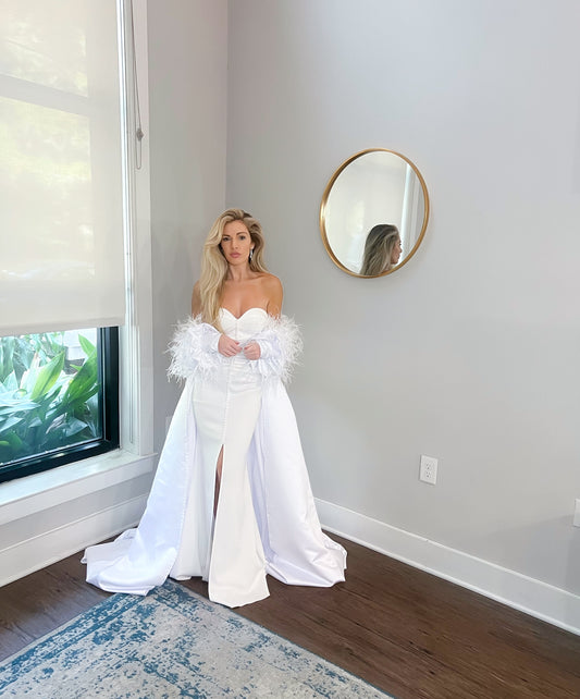 Luxurious Off-Shoulder Cathedral Length Wedding Jacket: Ostrich Feathers & Pearl Sleeves