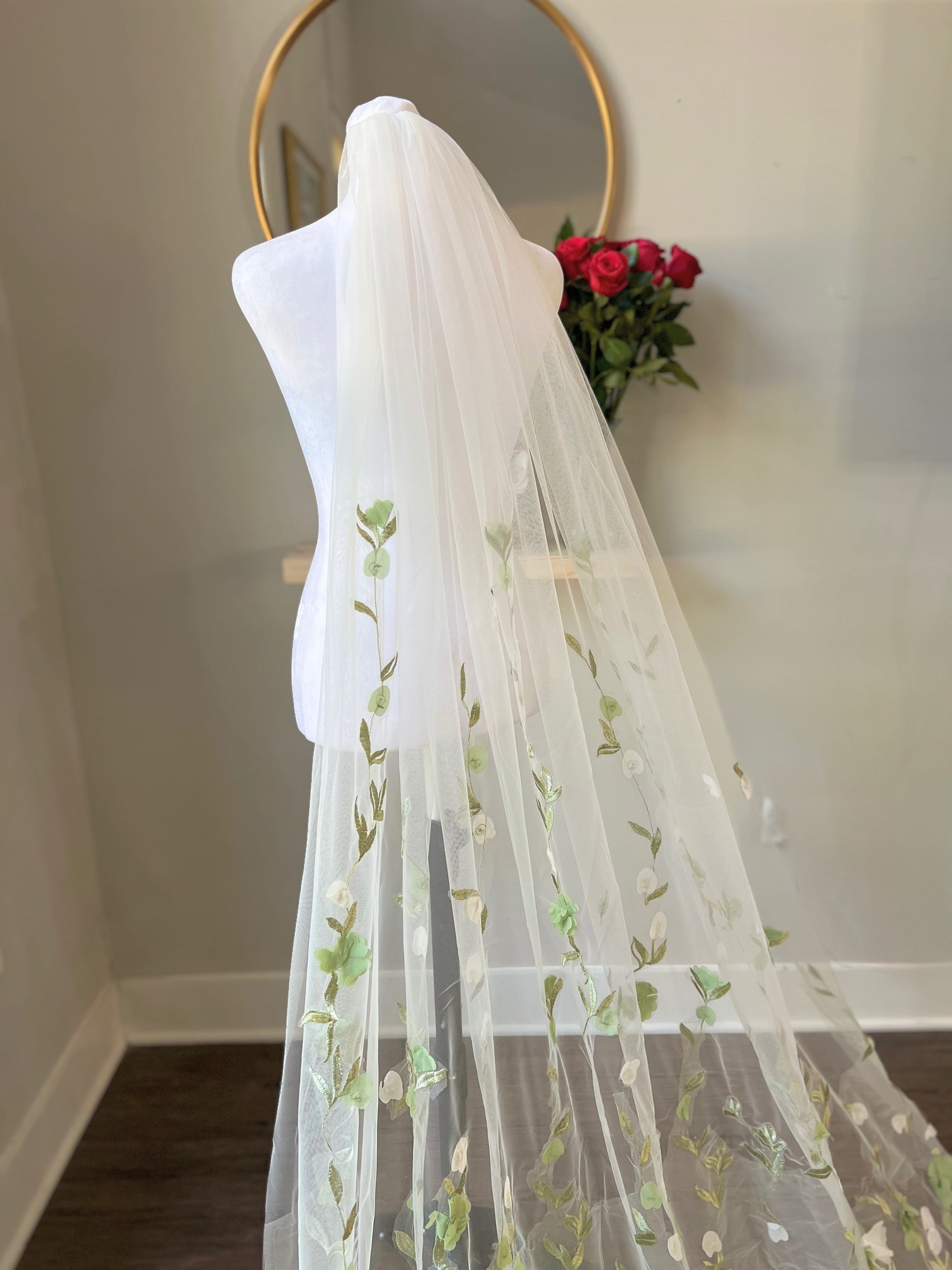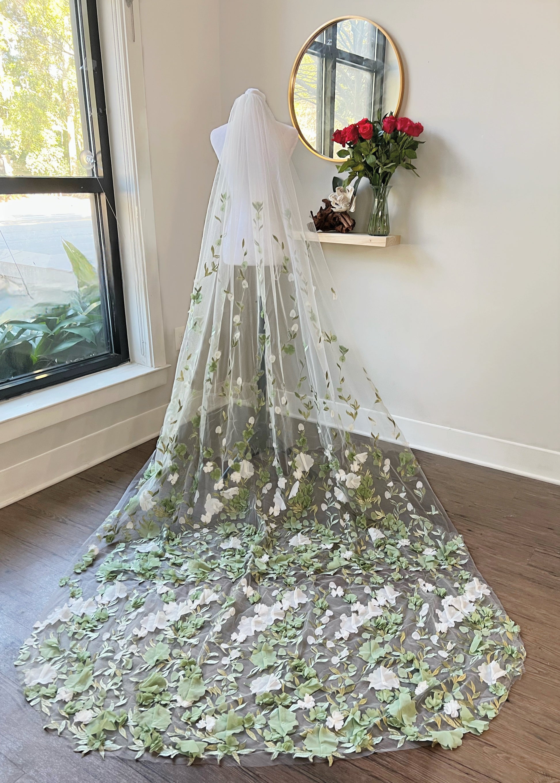 Make a stunning statement with this cathedral-length wedding veil featuring intricate green and white floral embroidery. Perfect for garden or nature-inspired weddings, this veil adds a touch of elegance and whimsy to your bridal look. The soft tulle cascades beautifully, creating a romantic and ethereal effect. Handmade with care, this veil is designed for the modern bride who loves timeless floral details.
