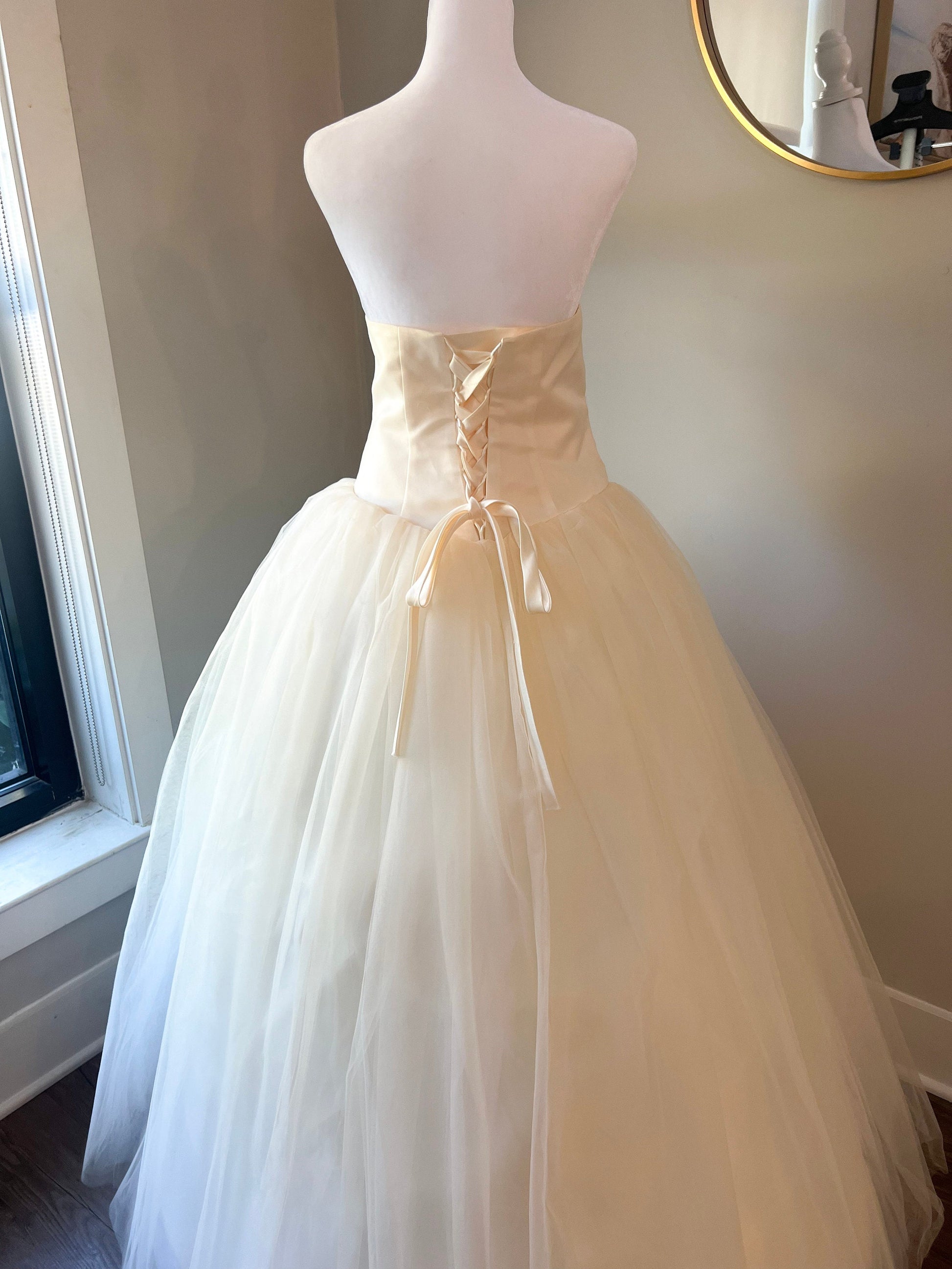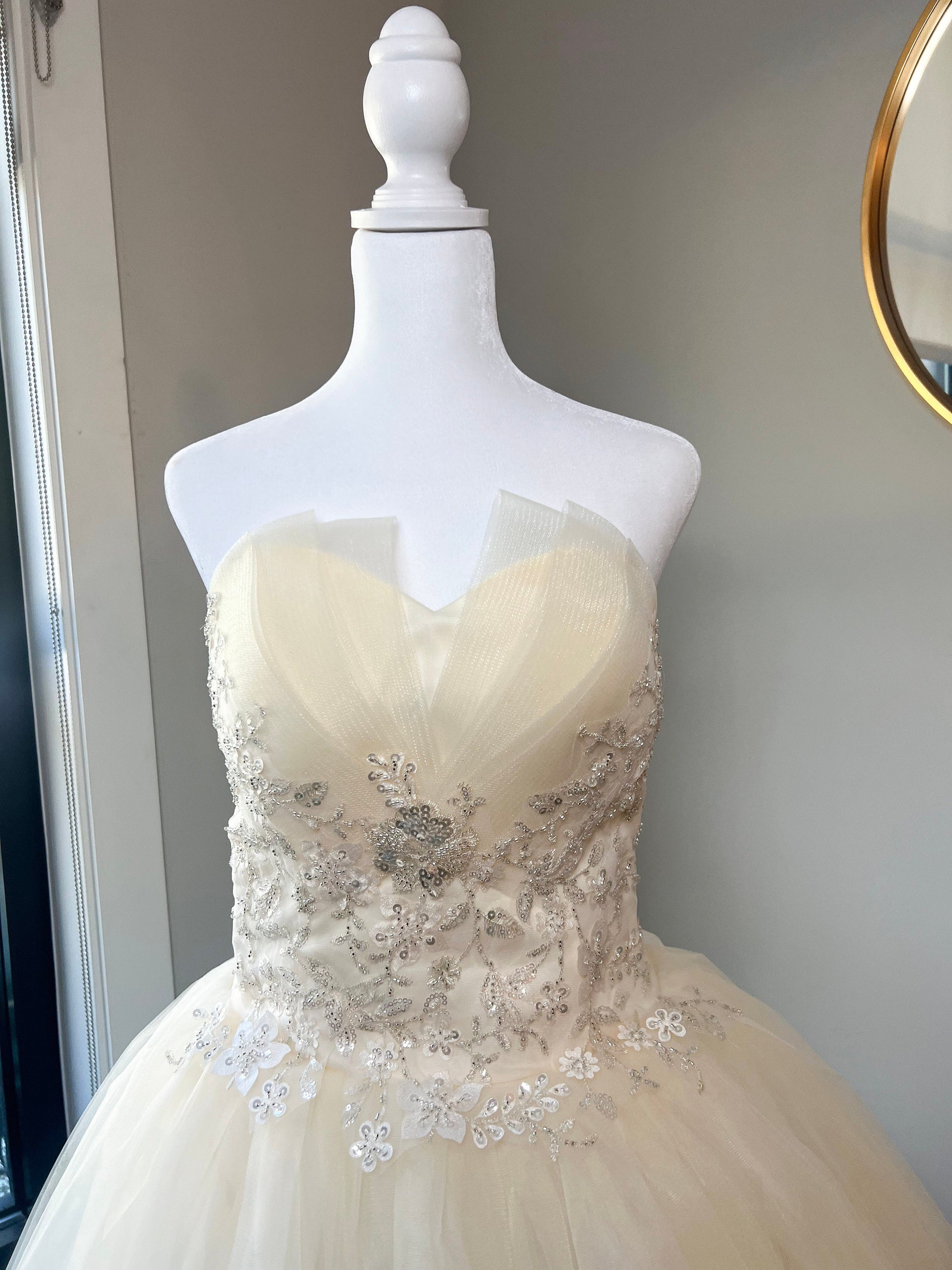 This gown is finished with shimmering tulle, beaded sequins and a corset top for a snug, perfected fit. It can be worn with or without a petti coat (which is not included).