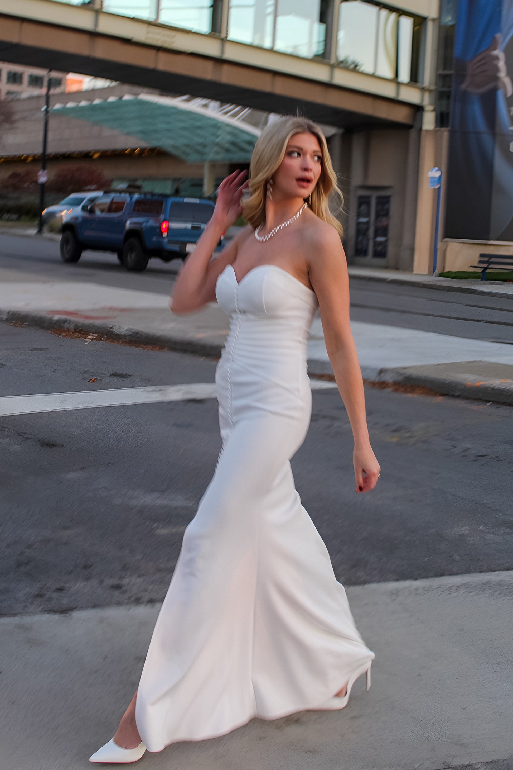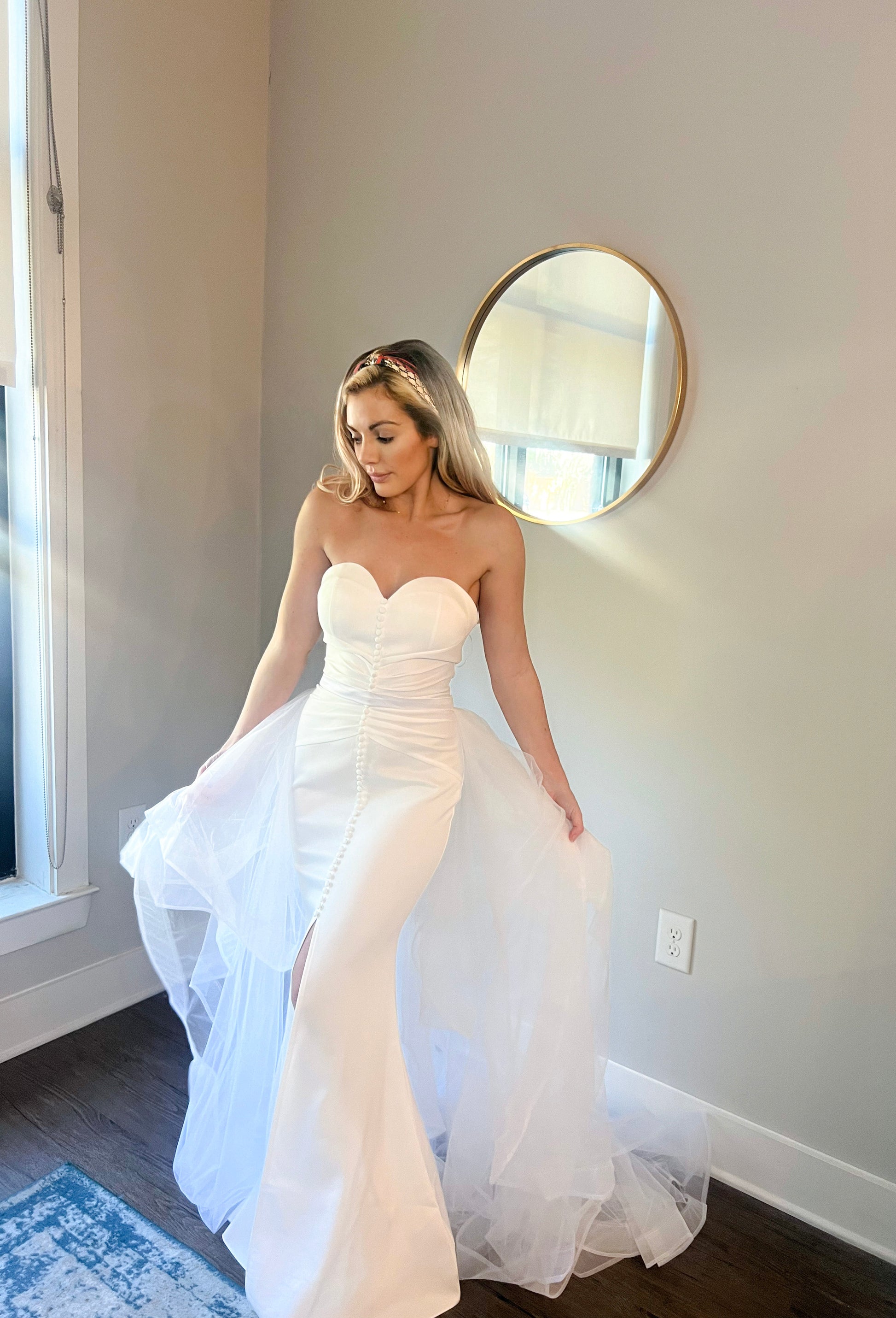 This gown combines classic elegance and modern minimalism. This gorgeous gown will look amazing solely or easily pairs with any of our detachable wedding trains! Its form-fitting mermaid silhouette emphasizes your shape, while the sweetheart neckline provides an eye-catching and romantic touch. Buttons from the bodice lead to a dramatic split in the front to complete the look. Crafted from satin/jersey fabric for a comfortable fit, it's the perfect dress for a night to remember.