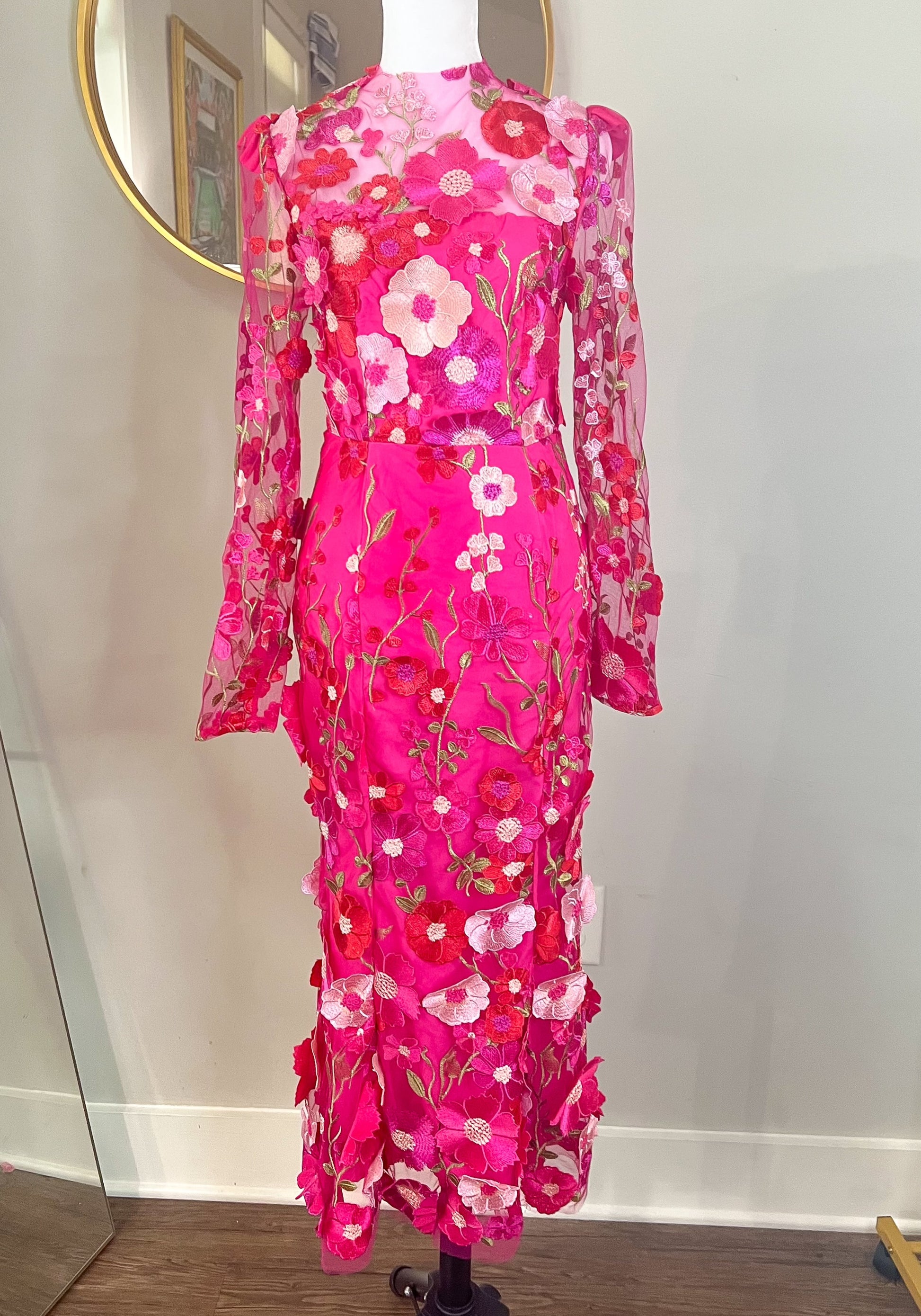 Long Sleeve Hot Pink Floral Midi Wedding Guest Dress