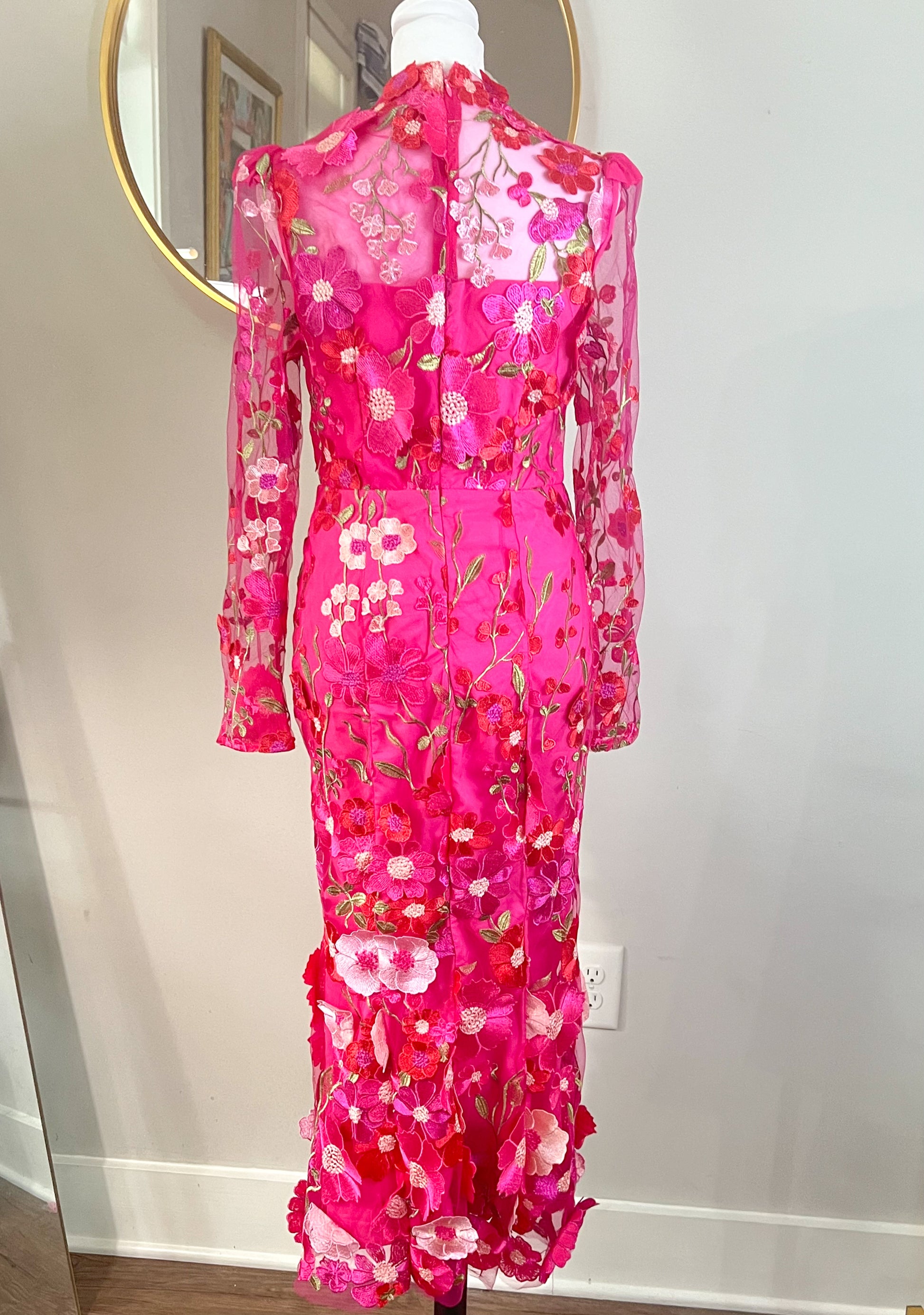 Expertly designed for the modern wedding guest, our Long Sleeve Hot Pink Floral Midi Dress showcases a high neck and elegant long sleeves. Adorned with beautiful floral appliqués, this stunning evening gown exudes sophistication and style. Perfect for any formal occasion, make a statement in this unique and feminine dress.