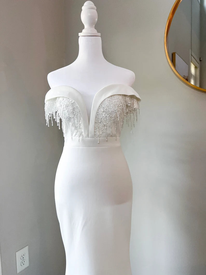 Mermaid Off Shoulder Appliques Wedding Reception Dress with Tulle Train