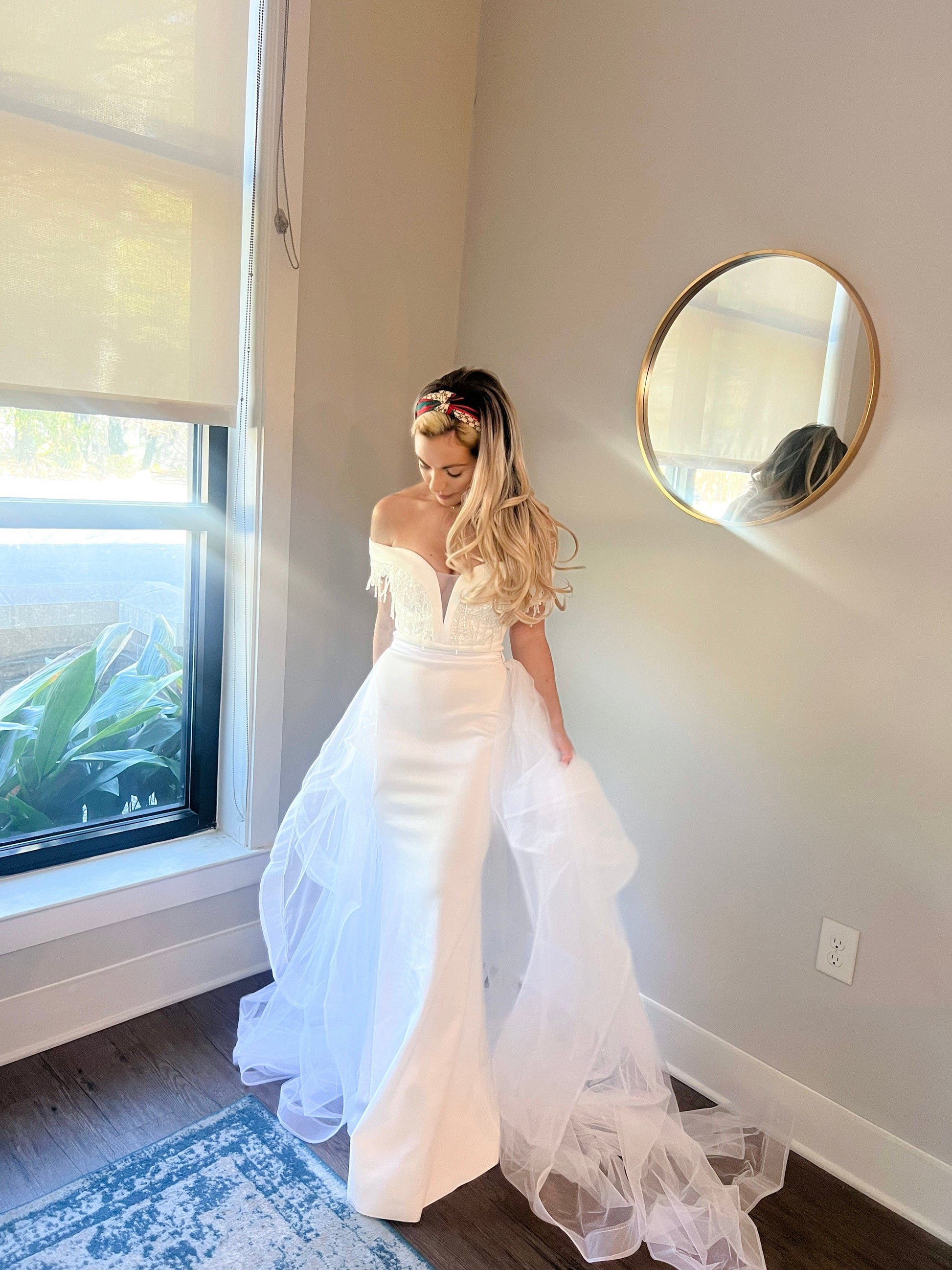 The skirt of the dress flows gracefully, draping elegantly to the floor and creating a captivating silhouette. The lace appliques on the skirt add a touch of whimsy and romance, elevating the dress to a whole new level of sophistication. The back of the dress features a concealed zipper closure for a seamless and secure fit. This dress comes with a detachable tiered tulle train for easy removable for your reception party.