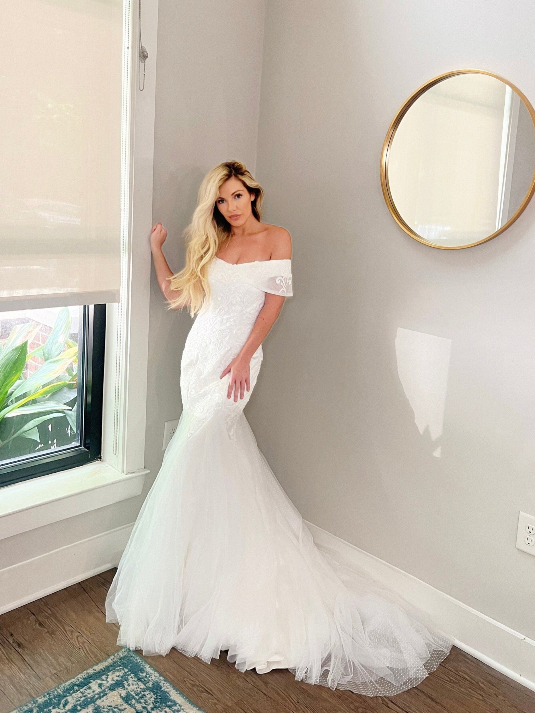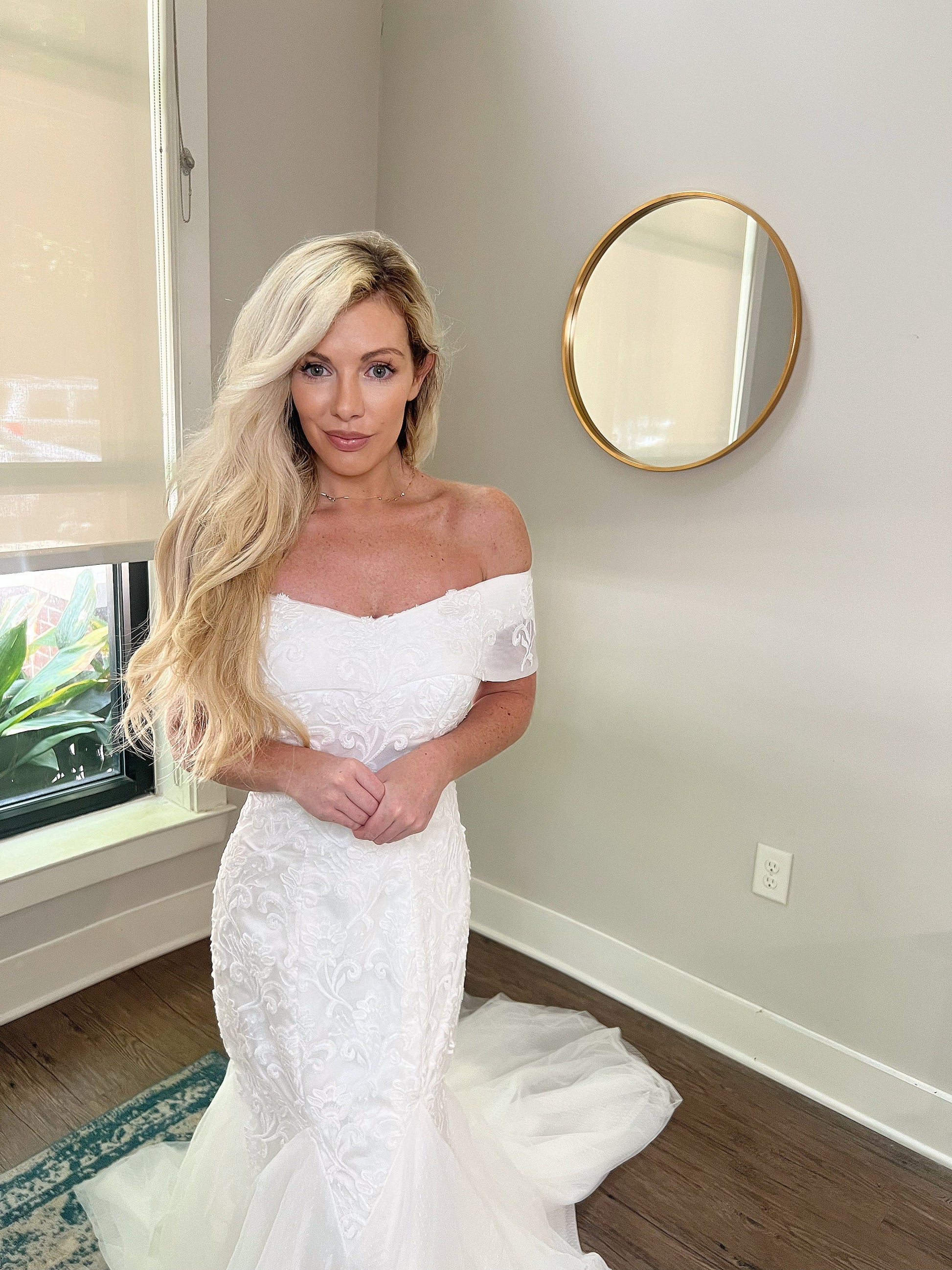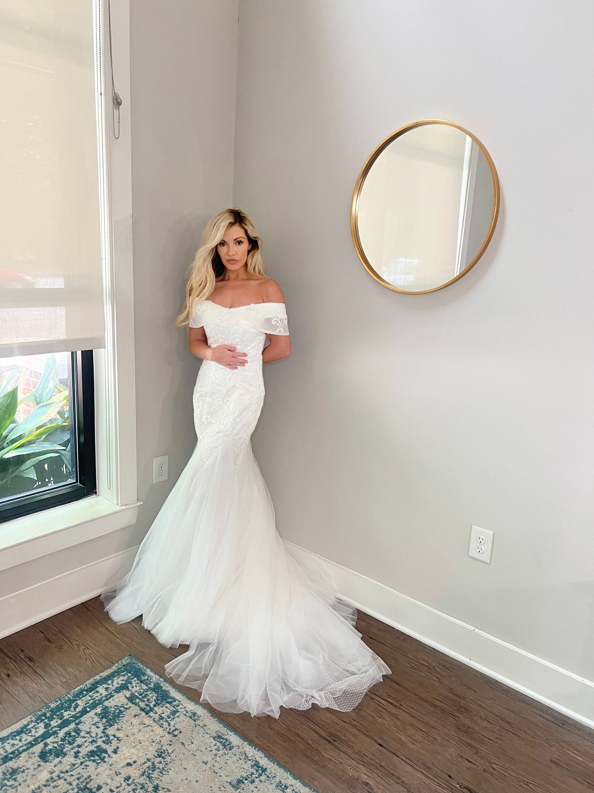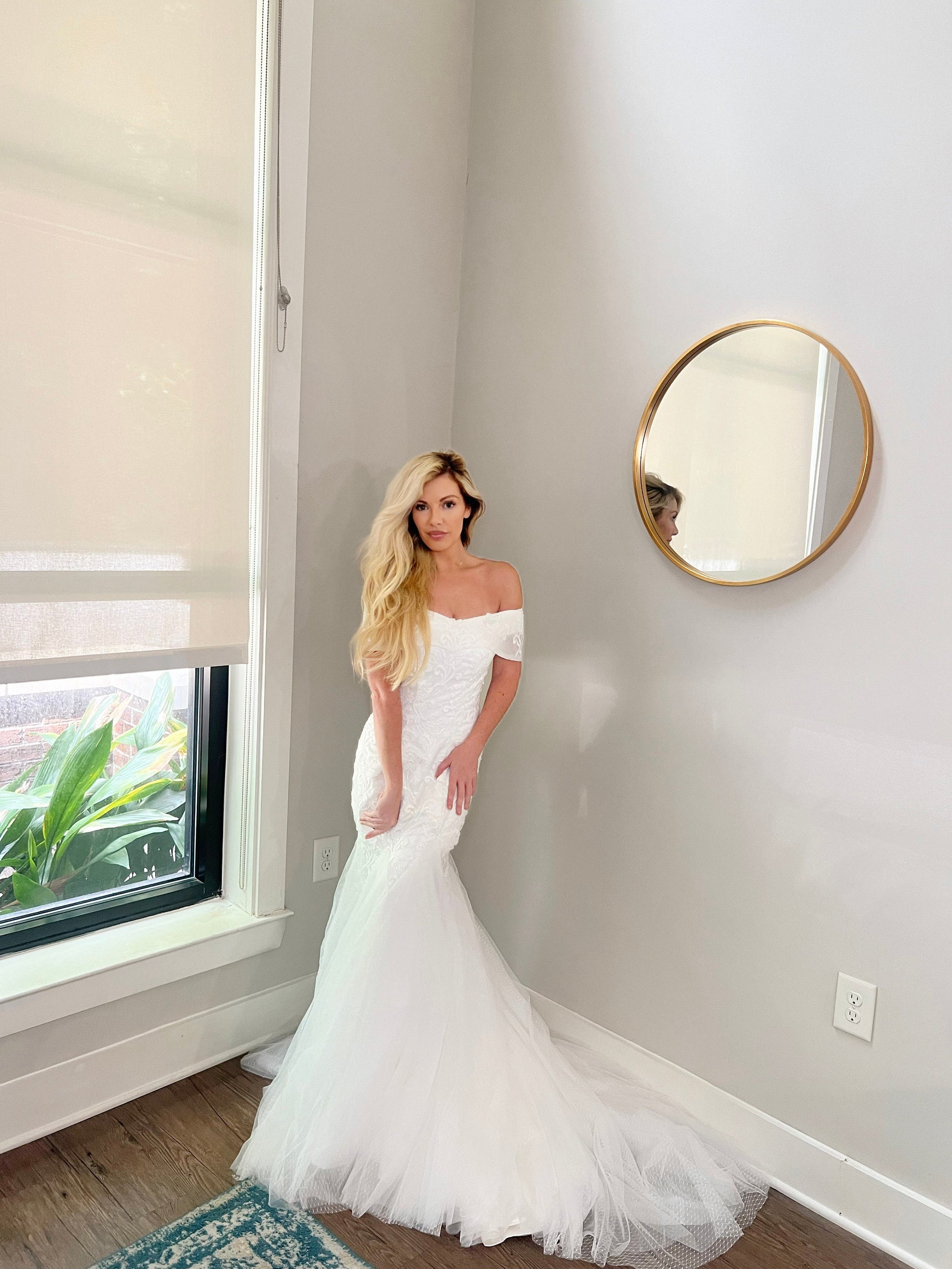 This beautiful mermaid wedding dress is sure to make your wedding day special! The back of the gown is a lace up design to give you a form fitting look. The bottom of the gown is a court train layered in beautiful tulle. The bodice of the gown is layered in sequins and lace.