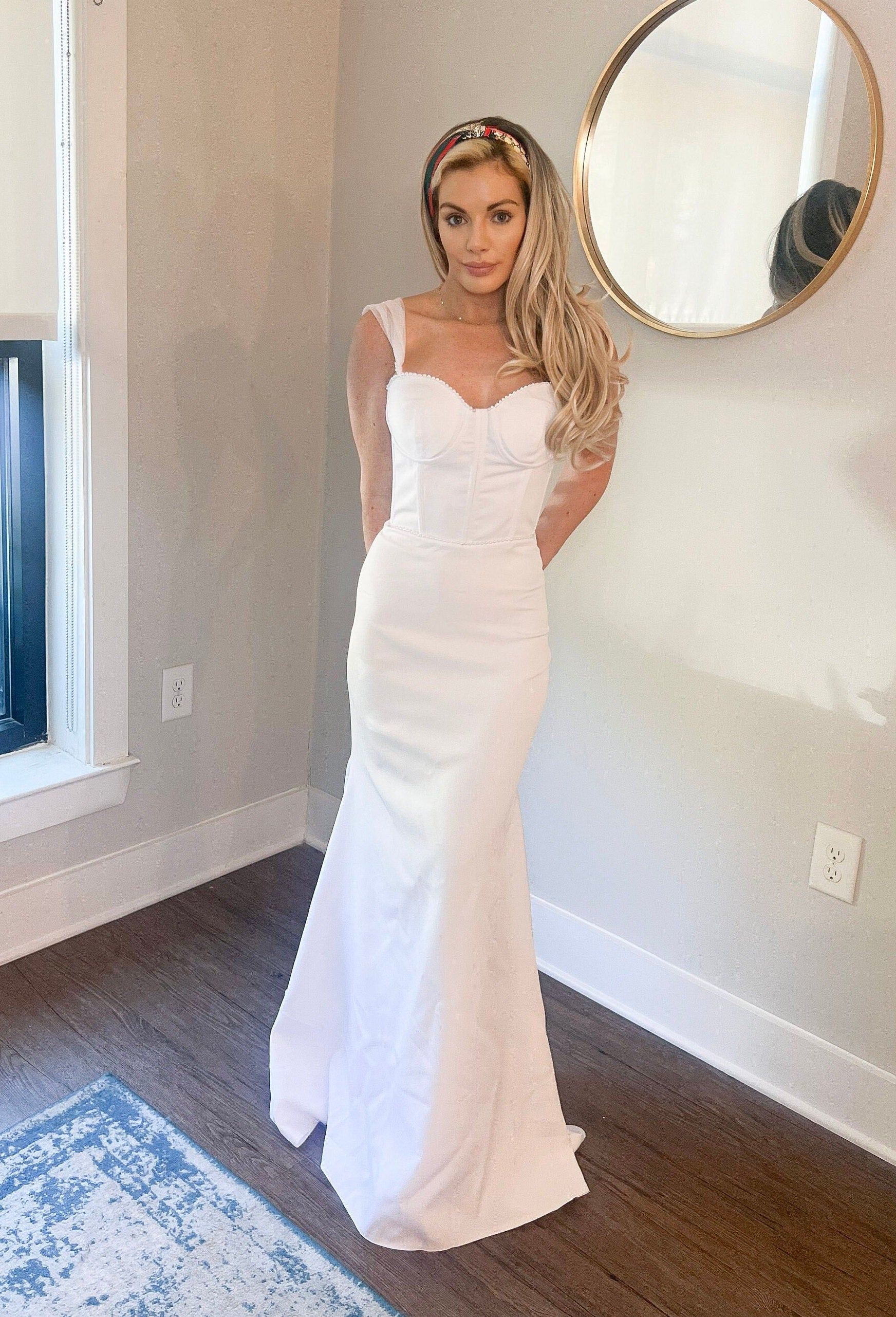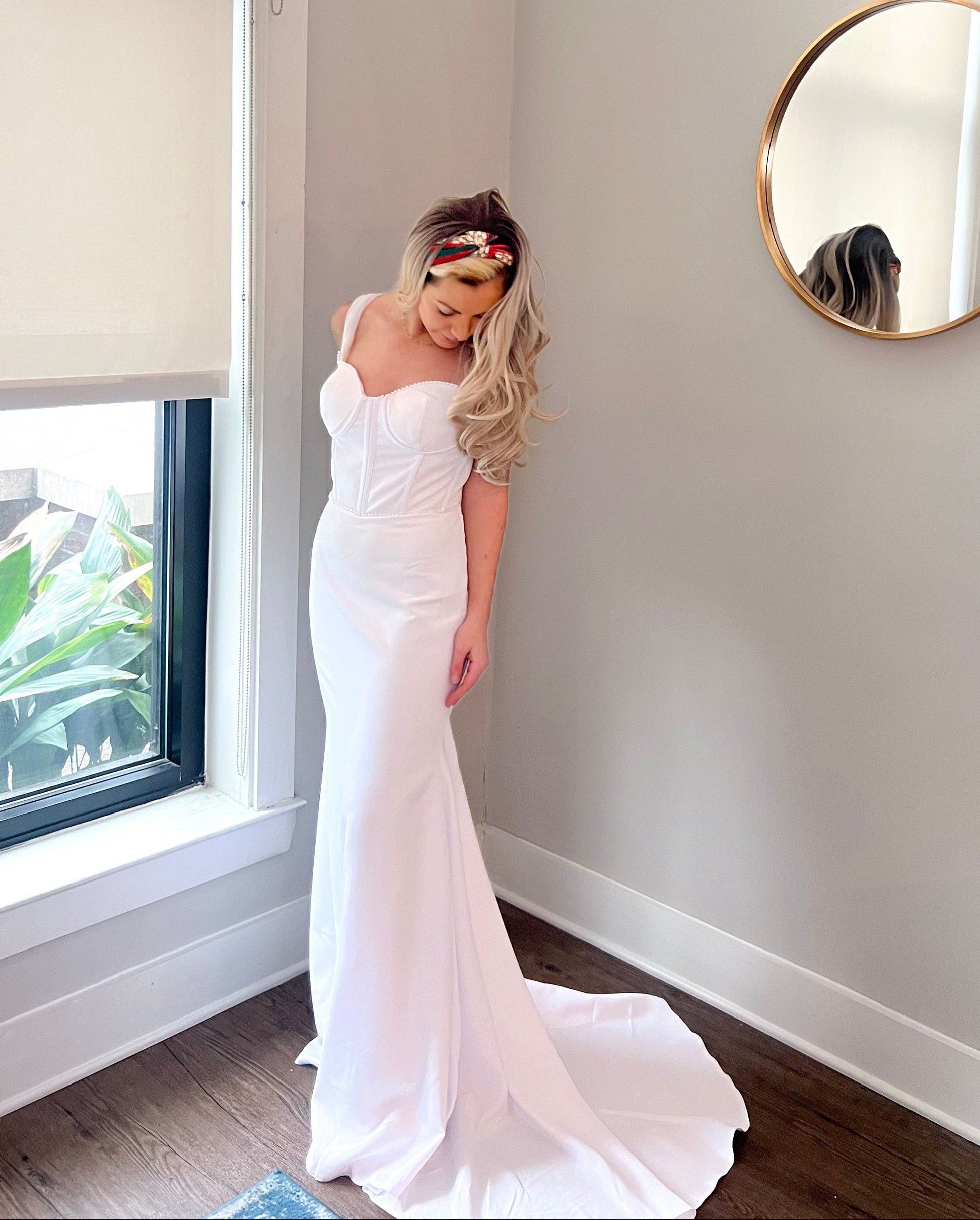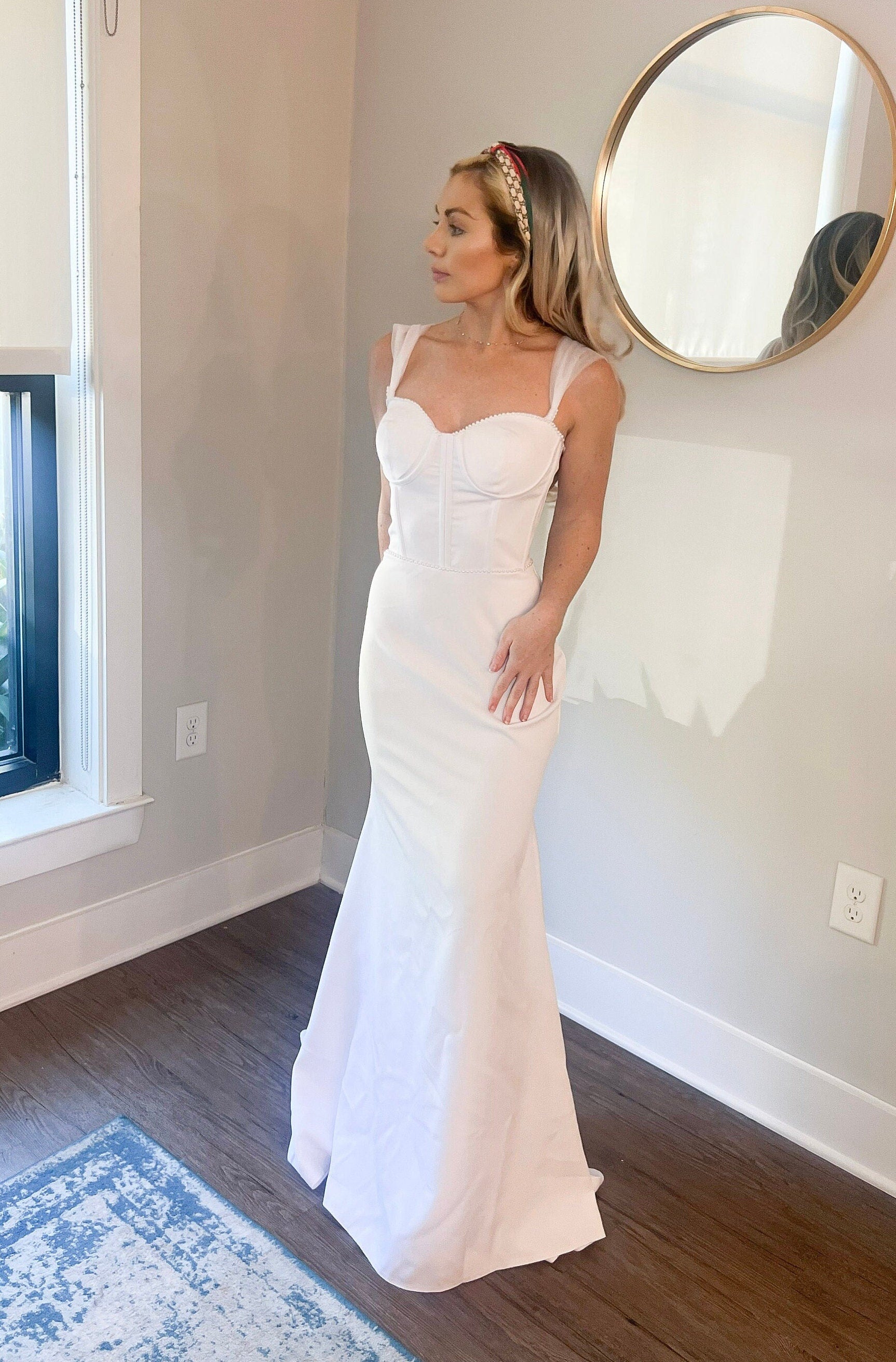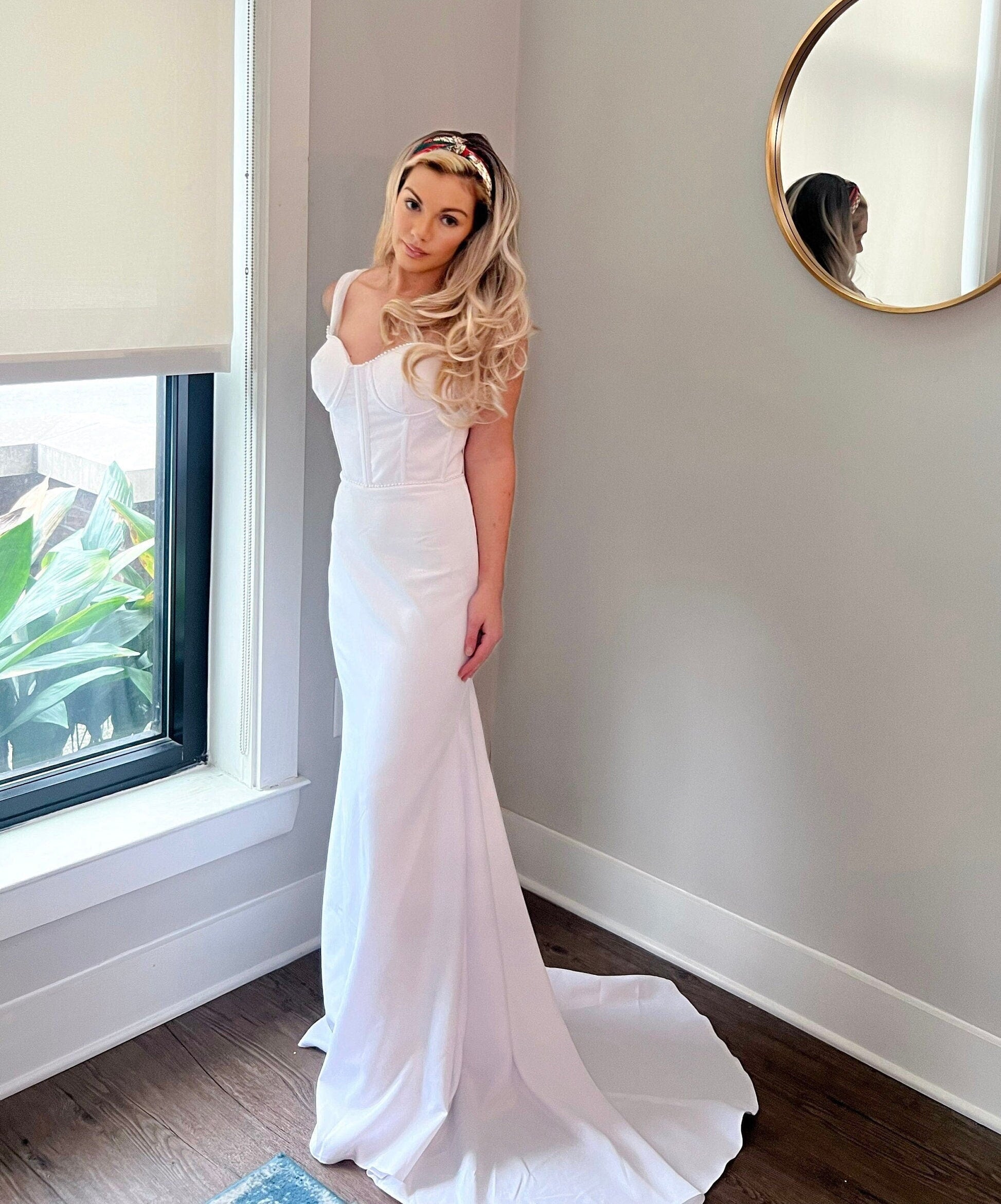This full-length mermaid-style dress offers an optional off-the-shoulder tulle design. Crafted with a corset structure to enhance the figure, it is adorned with pearls for a sophisticated finish. The dress is further accented with a subtle train for a touch of glam.