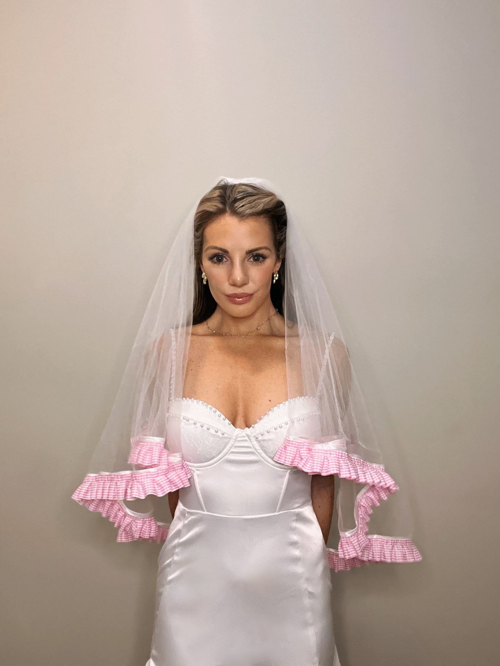 Pink Pretty Gingham Ruffle Trim Wedding Veil, Bachelorette Party Bridal Veil