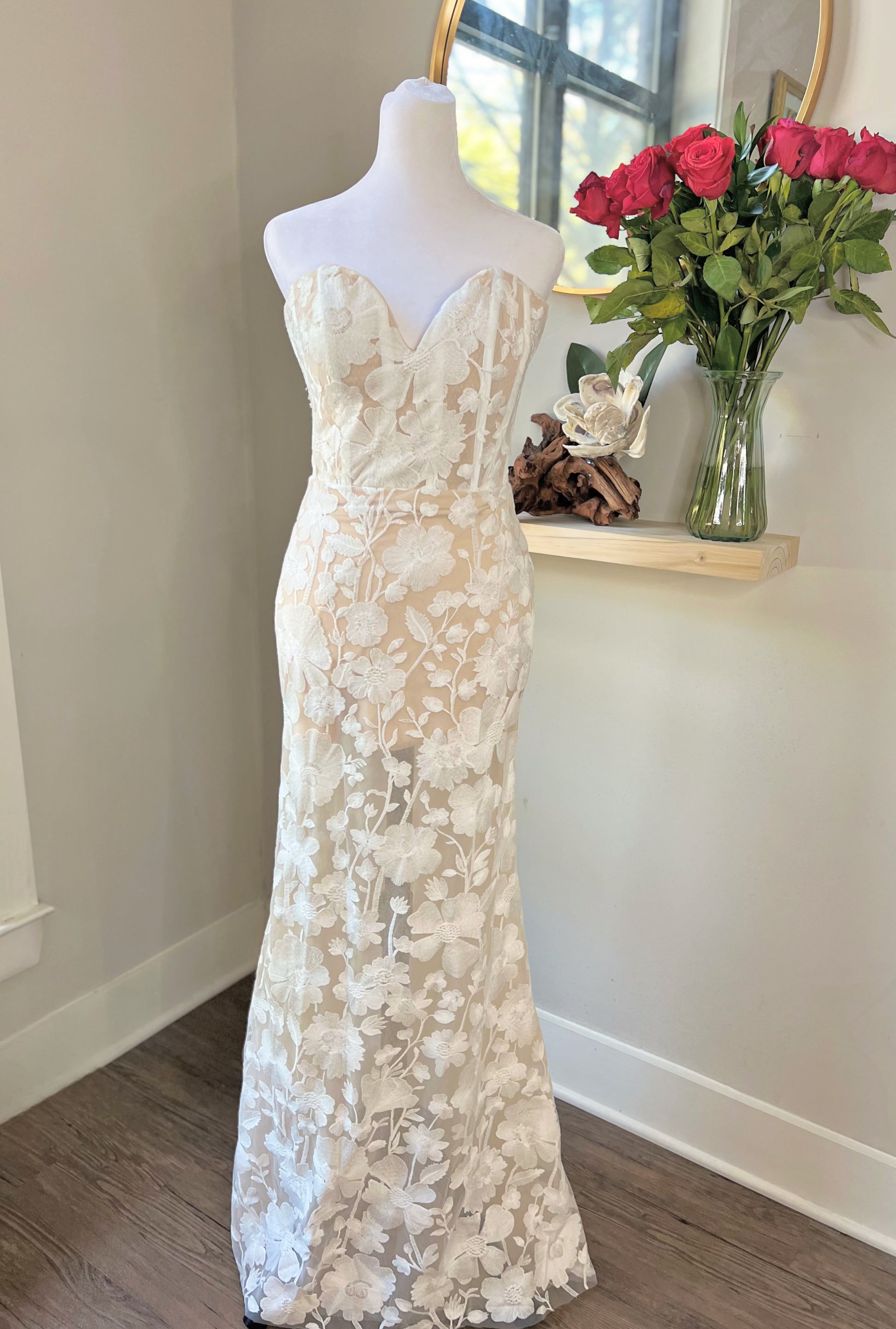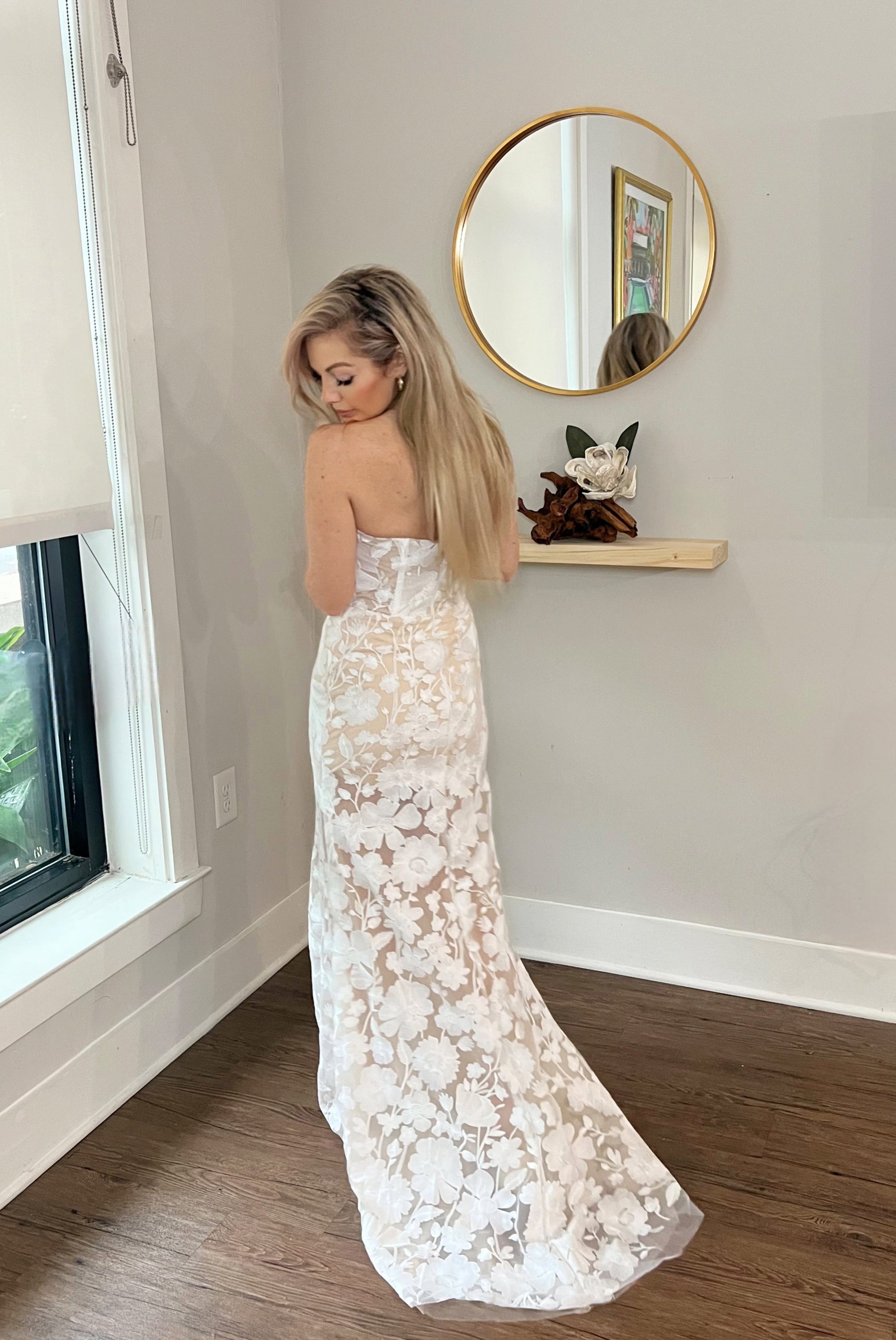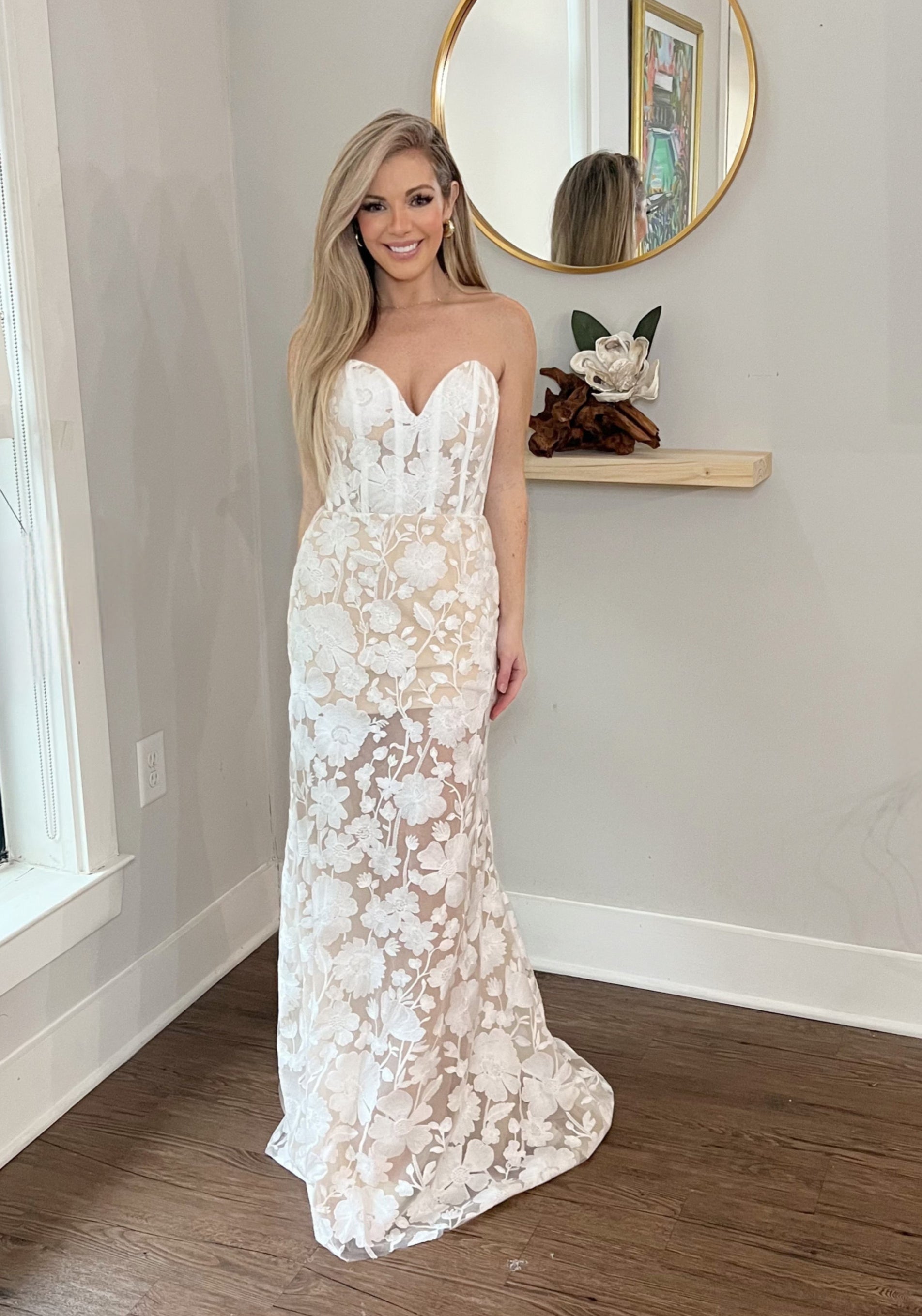 Step into elegance with this breathtaking floral lace wedding gown, featuring a sweetheart neckline and a sheer, figure-flattering silhouette. A perfect choice for brides who love timeless romance with a modern twist.