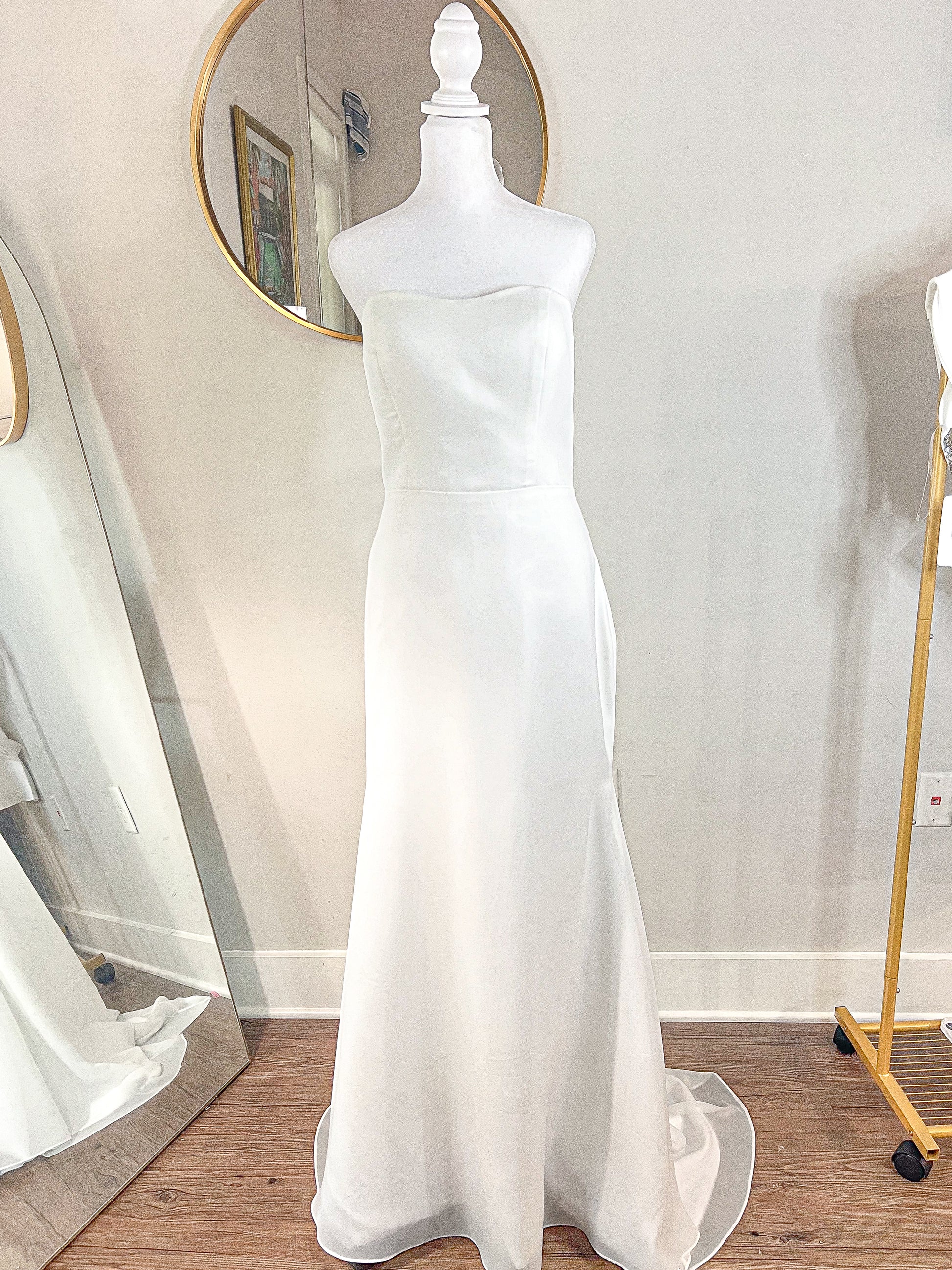 This stunning wedding gown boasts a simple mermaid silhouette and a delicate sweetheart neckline, perfect for the bride seeking an elegant yet simplistic look on her special day. The small train adds a touch of romance, making it ideal for outdoor weddings or elopements. Effortlessly achieve a timeless and sophisticated bridal style with this gorgeous dress.