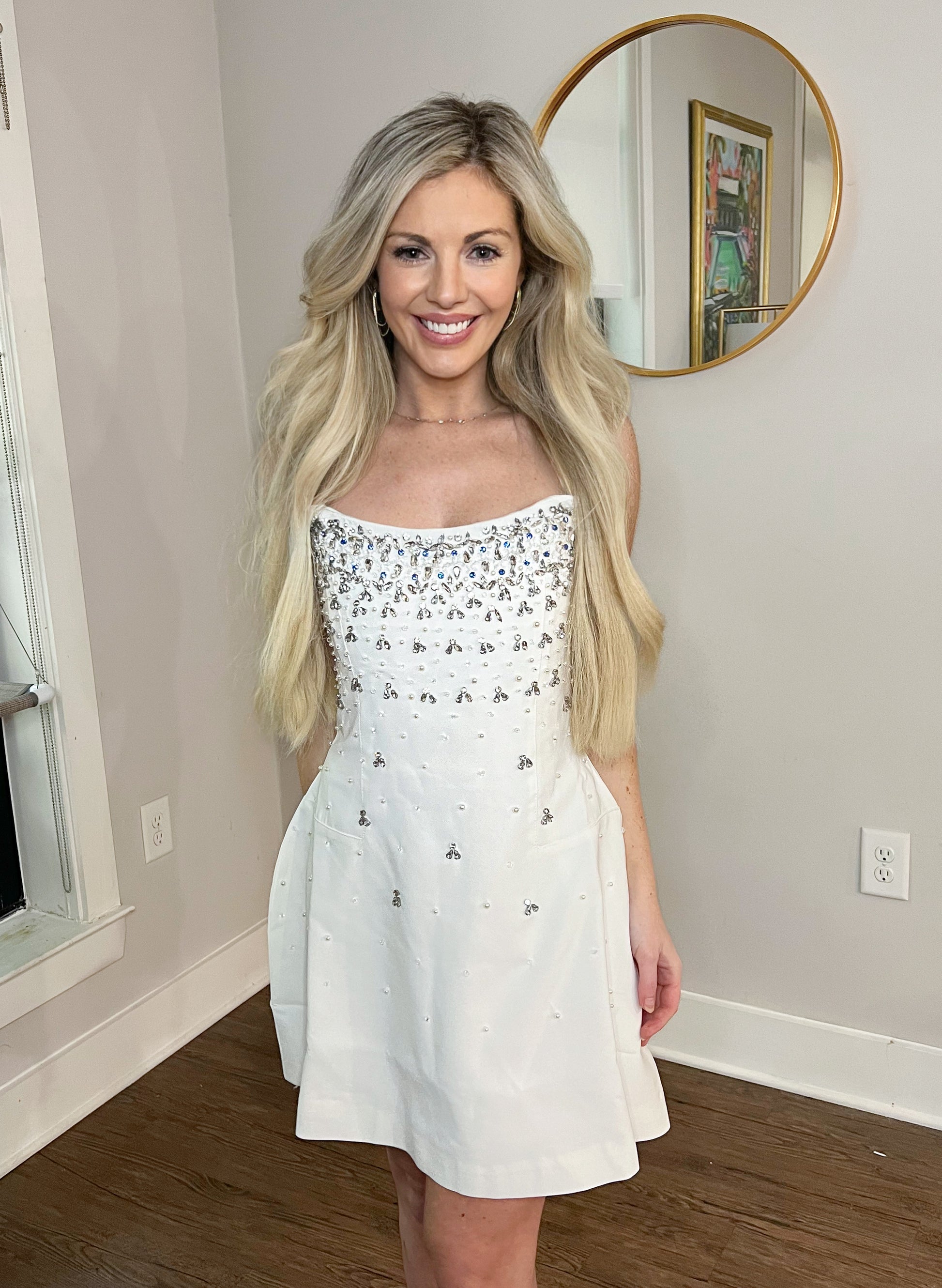 Captivate the room at your wedding reception with this enchanting cocktail dress, featuring a shimmering tapestry of silver beads and sequins. The elegant silhouette is perfect for any bride, promising to make a glamorous statement. The dress features a hidden bra strap to allow for a form fitting, tailored look.