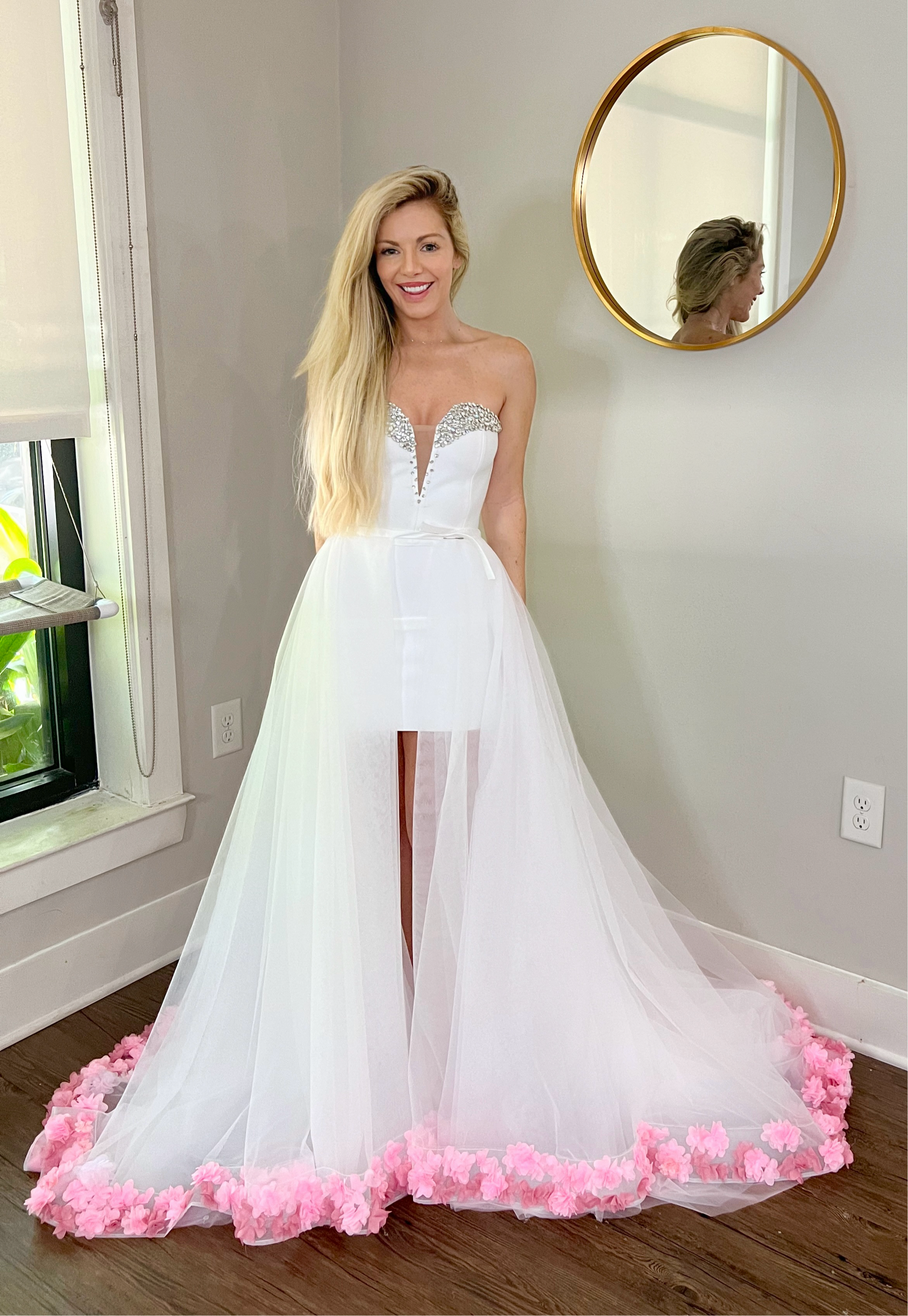 Discover the perfect blend of modern elegance and timeless style with this strapless bridal mini dress. Featuring a flattering sweetheart neckline adorned with sparkling embellishments and a sleek silhouette, this dress is ideal for your reception, elopement, or special bridal event.