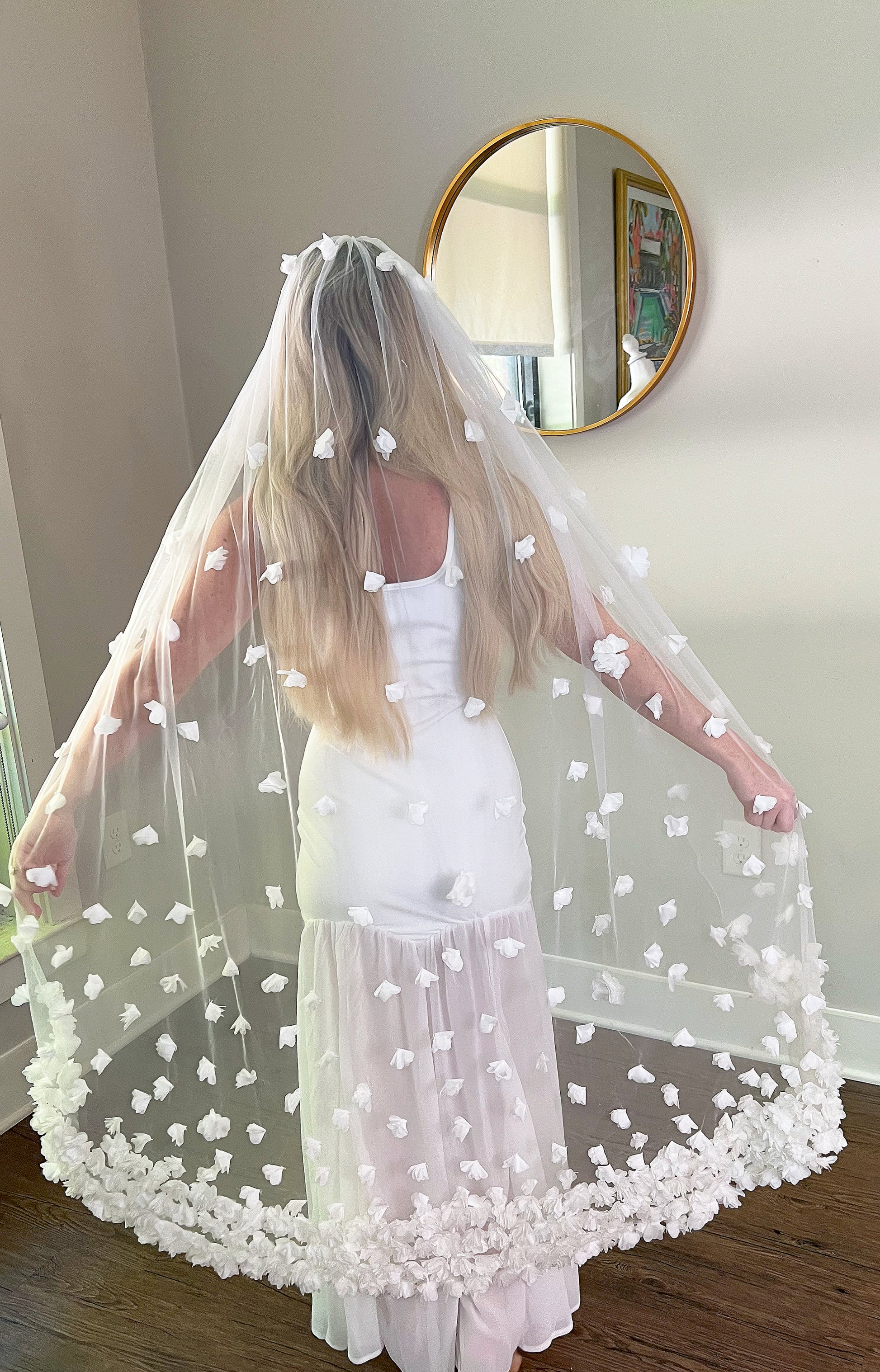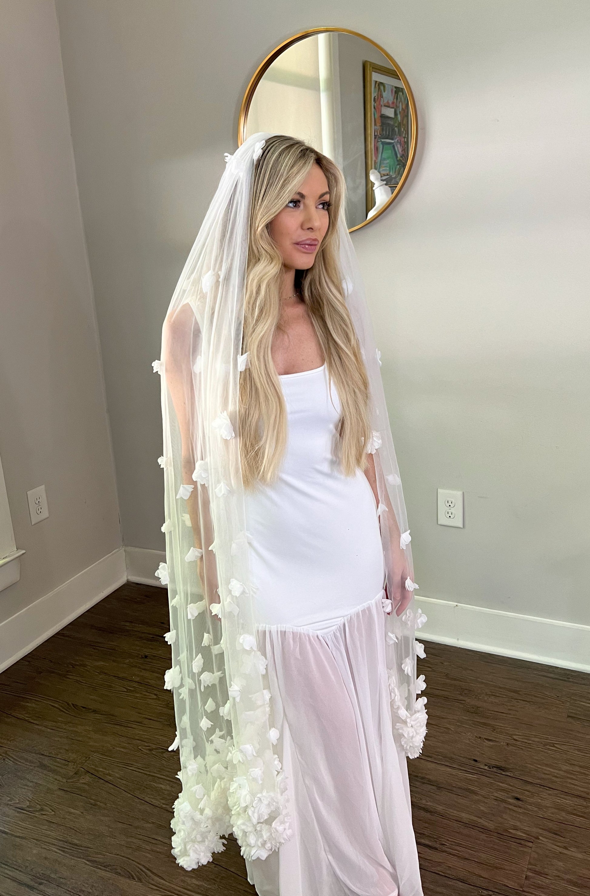 Whimsical Romantic Garden Party 3D White Flower Appliqués Waltz Length Bridal Veil
