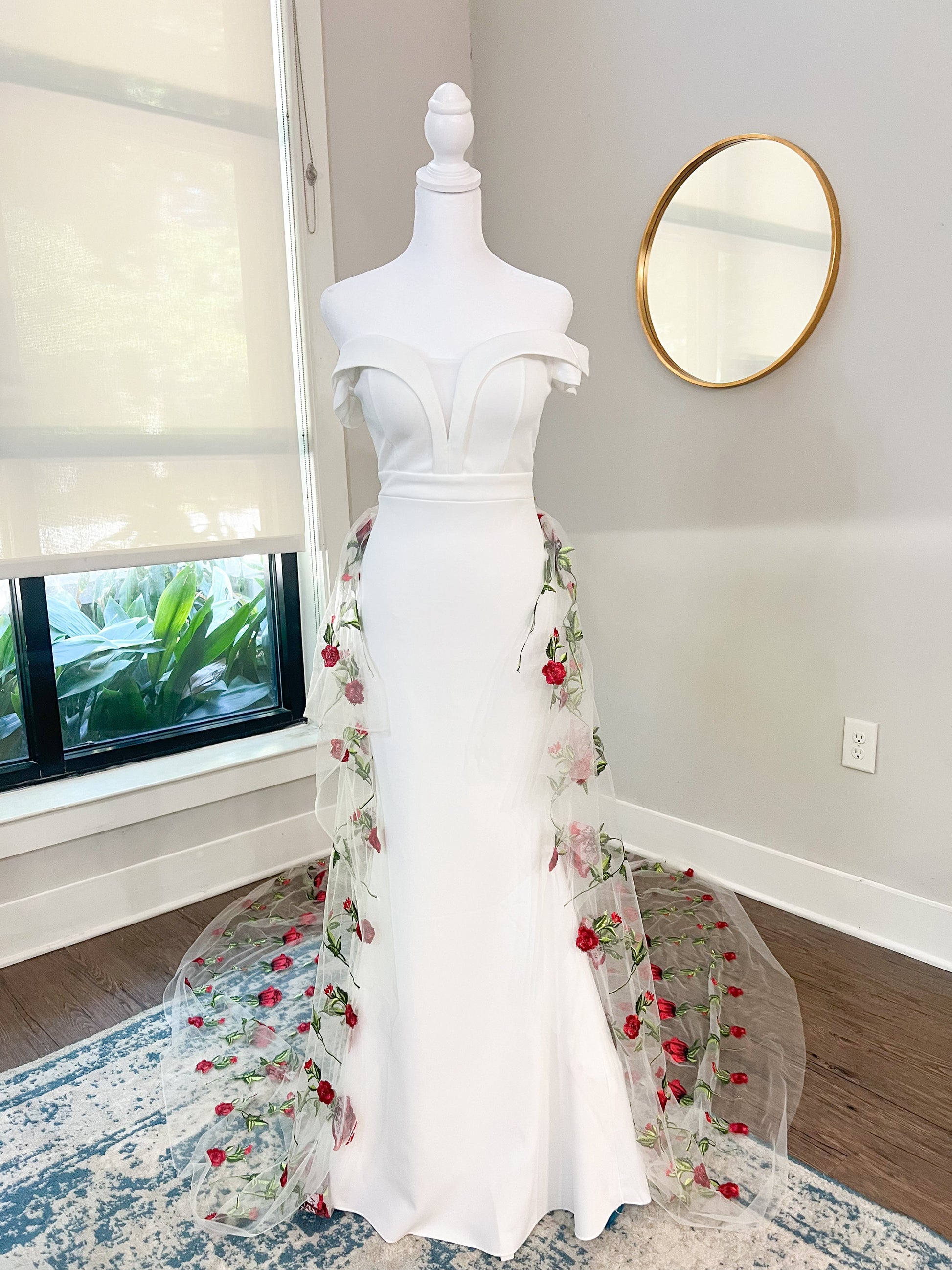 This two-piece wedding dress features a sweetheart neckline and a detachable train. This season, brides are opting for floral wedding trains to complete their aisle-ready look. Crafted from semi-sheer fabric, the train can be made to any length to suit both long or short dresses. In addition, the pins included offer an uninterrupted, beltless look, allowing you to position the train on your gown as you see fit.